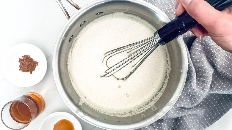 - In a saucepan over medium-high heat, combine the coconut cream, nutmeg, and salt. Stir often, until the mixture reaches a simmer.