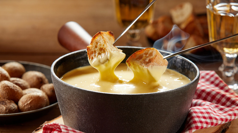 While there may not be a perfect cheese for fondue, Foods Guy admits that one traditional choice is Gruyere. That cheese is often paired with Gouda and Fontina. Given that these cheeses melt well, they are an optimum choice. Since fondue is often associated with Switzerland, Alpine-style cheeses are often used more frequently, which often have a creamy texture. Harder cheeses, like cheddar, can crumble, which can be an unpleasant texture. Even with the better cheese in the pot, a few tricks can make sticking the flavor and consistency even easier.