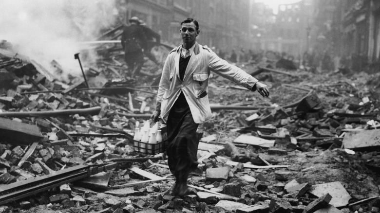 During World War II, London was heavily impacted by German bombing attacks. The city was in shambles, and the realities of war were unignorable for the country, much less the Londoners. According to War History Online, a photo of a stoic milkman working in uniform porting glass milk bottles among the ash and rubble quickly gained traction as a symbol of English resilience. Interesting to note, as the source explained, is that the milkman in this photograph wasn't a real milkman. The photographer's assistant borrowed the coat and milk crate of a passing milkman and together he and photographer Fred Morley sought to depict wartime in London. The photo to this day remains a reminder of the tenacity of the English force and country.