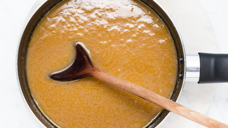 Once the butter melts, turn the heat up and bring the liquid to a boil. Let the ingredients bubble for about 15 minutes, making sure to stir constantly so nothing sticks to the pan and burns.