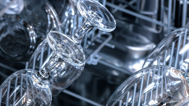 You've run into a dilemma: You just pulled your glasses from the dishwasher, but they're covered in a cloudy film. What causes this cloudiness? According to Maytag, a common reason for cloudy glasses is hard water deposits. The two primary minerals in hard water are calcium and magnesium (per USGS). When these minerals settle on dishes, creating deposits, they form a cloudy coating.