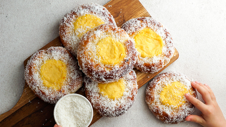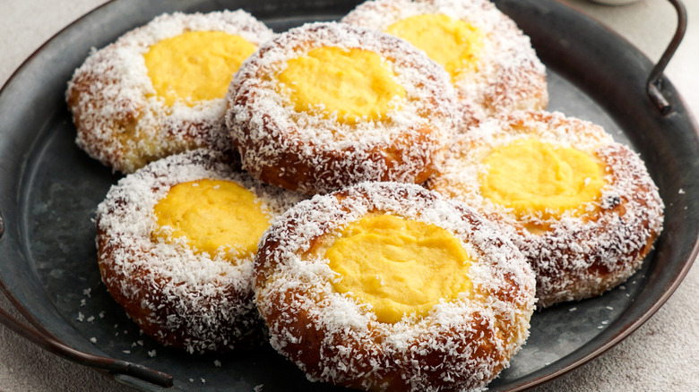 The treat sort of resembles American donuts. Skolebrød is a sweet roll made from a milk-based, yeasted dough and baked (via food blog Living a Nordic Life). Their open custard centers, like sunny-side-up eggs, and desiccated coconut coats set them apart from the pack, making for excellent desserts that can be enjoyed at home or in your kid's lunchbox (hence the name).