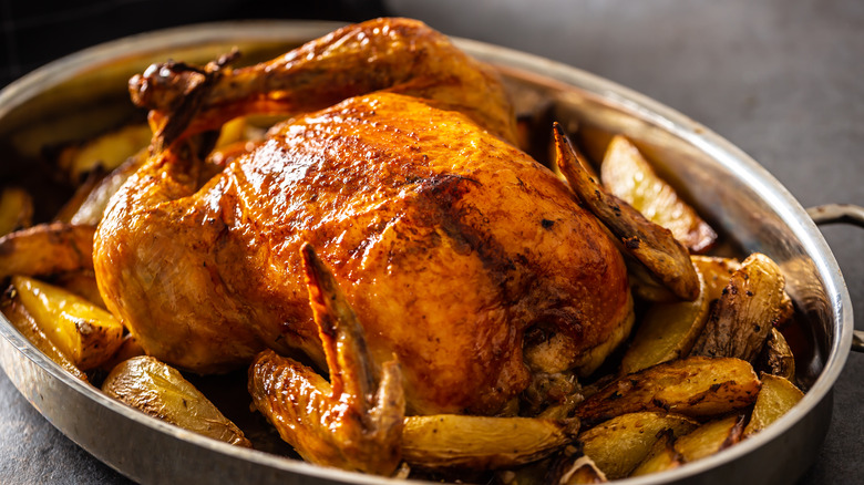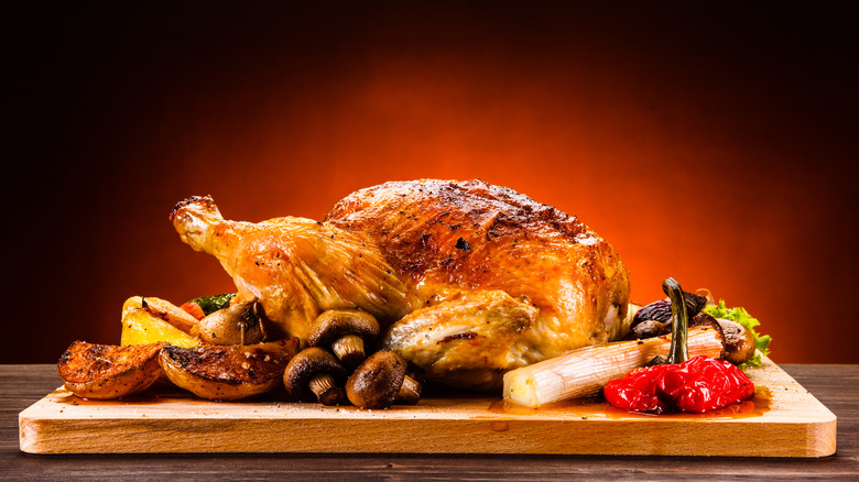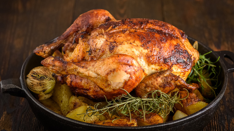While frying and grilling chicken has its own set of perks, there's really nothing like digging into a hot and juicy roasted chicken. When paired with your choice of potato and a side vegetable, you have yourself a quintessential Sunday dinner. Juicy, tender meat underneath a flavorful crispy skin that's been covered in anything from herb butter to lemons, a roast chicken is a versatile dish that's filling and affordable.