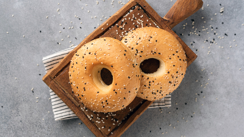 According to The Greater Knead, frozen bagels can be safely stored for up to four months when wrapped up — though the site does recommend slicing your bagels in half before freezing them so they will be easier to split apart before thawing. When you're ready to heat up a bagel, you can thaw it in the microwave for about a minute, adding time in 15-second intervals as necessary. Then, you can toast to your desired crispiness, and add your favorite toppings to enjoy!