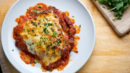Another example is chicken parmesan: butterflied chicken cutlets baked under a bed of marinara sauce ("red sauce," if you please), seasoned bread crumbs, and bubbly mozzarella cheese. While a similar dish was invented in Italy, its poultry-based counterpart was not.