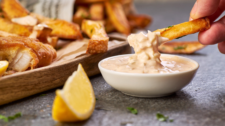 Tartar sauce's exact origins are not clear, but it's believed that the recipe comes from France (via The Straight Dope). In its early days, it was served alongside steak tartare.