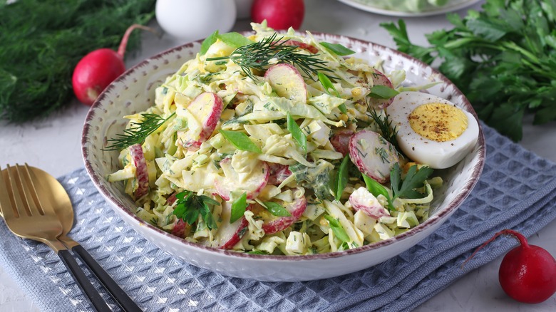 First and foremost, kneel down and worship the green goddess dressing. Per the Palace Hotel in San Francisco, California, the sour cream-based dressing originated there in 1923. It hasn't aged a day if you ask us. Though they're not everyone's favorite, anchovies add a briny saltiness that makes the dressing so unique. The specific combination of herbs is an absolute must to not only give the sauce its vibrant hue but its incredible taste. So be sure to stock up on tarragon, parsley, dill, chives, and garlic in addition to your favorite head of lettuce.