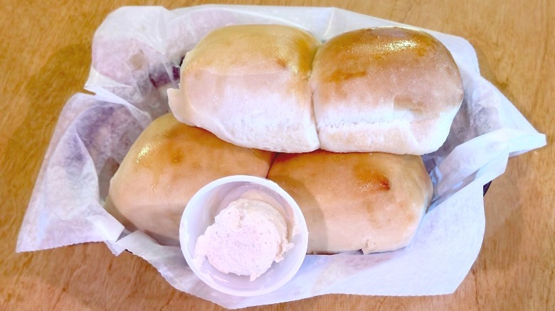 If you're new to the Roadhouse, these aren't your typical rolls and butter combo. The butter is a little bit of heaven. While the roll itself features sweet dough, the butter acts as another sweet component with the honey and cinnamon swirled in. But it's not overpowering at all — it complements the buttered roll perfectly. I also adore how the top of the rolls are brushed with butter before they're cooked, offering a nice and light shell that covers that soft, pillowy inside.