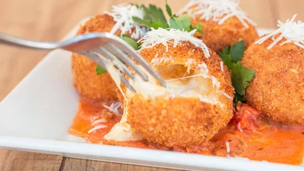 The Cheesecake Factory's Fried Macaroni and Cheese start with pasta and cheese shaped into a ball, then it's coated with bread crumbs and fried. Once cooked through, the balls are served on a plate of creamy marinara sauce, then topped with even more cheese. But did you know that the menu item was inspired by French chef Alain Ducasse?