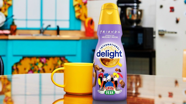 The coffee creamer powerhouse brand International Delight has linked up with Warner Bros. Discovery Global Consumer Products for a "Friends"-inspired creamer that's available at nationwide retailers for a limited time, per an exclusive announcement from People. The Manhattan Hazelnut Mocha Creamer, which also comes in the sugar-free form, takes cues from the "Manhattan Mocha" featured on Central Perk's chalkboard menu. The packaging is hard to miss, as it flaunts renderings of the sitcom's beloved pack of pals huddled around the recognizable coffee shop logo wielding the umbrellas they twirl around in the show's opening sequence.