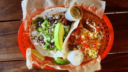 - Ace of Spades: jalapeno sausage link and grilled brisket topped with a fried egg, green chile queso, cotija cheese, sour cream, more cheese, and Diablo sauce, served on a flour tortilla.