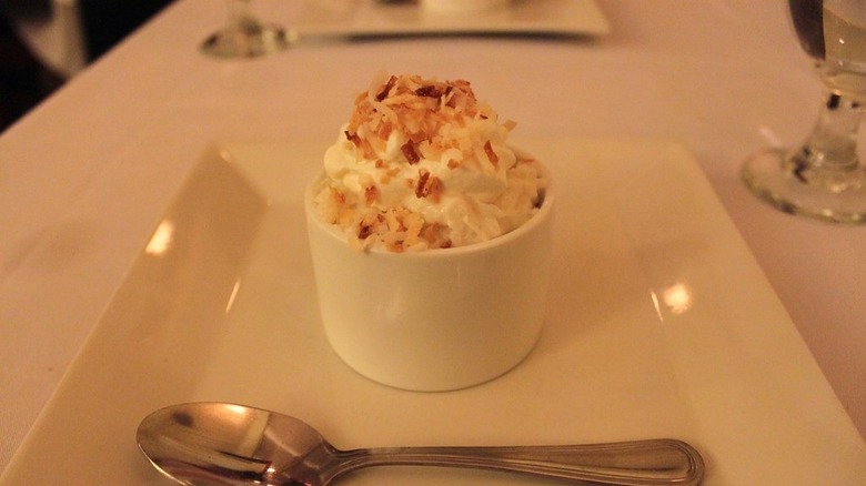 Rice pudding topped with whipped cream and toasted coconuts