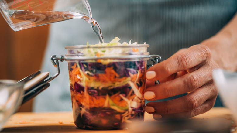 Because fermented foods contain probiotics and prebiotics, they can help support your digestive system. This is because the "good bacteria" in probiotics help your body process and metabolize the food you eat (via Cleveland Clinic). Adding probiotics into your diet and balancing your gut microbiome improve overall digestion and can even ease digestive issues (per BBC Good Food). Plus, the natural fermentation process partially breaks down food so it's easier for your body to digest — it's almost like putting food in a blender so your digestive system doesn't have to work as hard.
