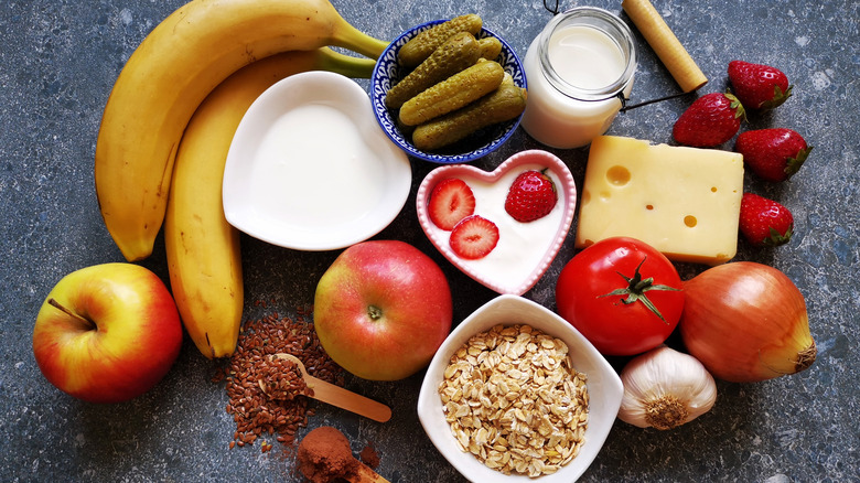 On the other hand, prebiotics are food materials that the "good bacteria" eat to survive and thrive. Typically, it's foods that are high in fermentable fiber, including fruits and vegetables like apples, asparagus, green vegetables and tomatoes, and whole grains like oats and wheat (via WebMD). Just like probiotics, prebiotics have been linked with boosting the health of your gut microbiome.