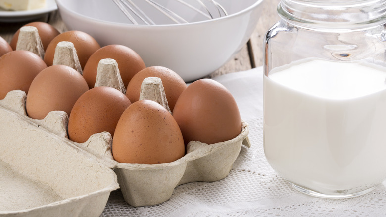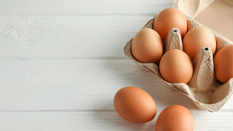 Finally, you should aim to use eggs within three to five weeks of the purchase date. If you're not sure how fresh they are, there are two ways to test them. Try the float test by filling a bowl with water and placing the eggs inside. A fresh egg will sink to the bottom, and an older egg will float. Another method is to crack the egg into a bowl and look at the yolk. According to Delishably, the yolk of a fresh egg will stand firmly above the white. If the white covers the yolk and the yolk looks sort of flat and sad, the egg isn't fresh.
