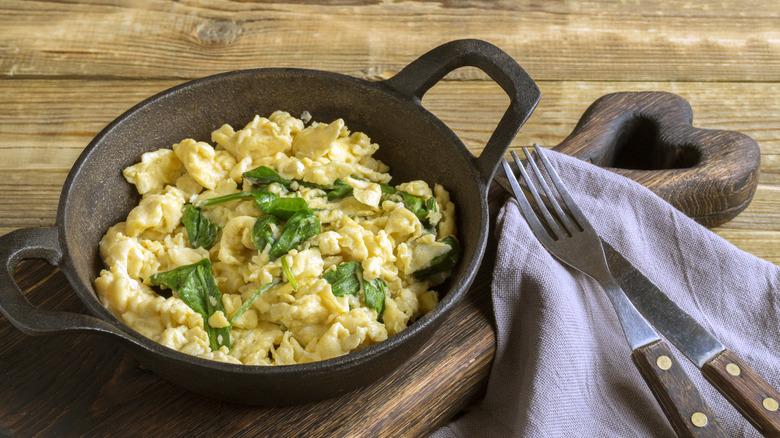 As well, using a pan that is too large can cause the eggs to cook too quickly, which can make them dry out (via Jessica Gavin). A pan that is too big also makes it difficult to control the temperature because the heat is distributed over a greater area, making it harder to maintain consistency. This can also cause the eggs to cook unevenly, resulting in a subpar texture.