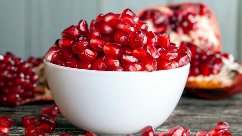 It's worth the effort, too. The edible portion of the pomegranate that surrounds the seeds are actually called arils, Healthline writes, and despite their juiciness, they're high in fiber and antioxidants as well as vitamin C, folate, potassium, and other nutrients that make them a healthy addition to any meal, even dessert. Healthline adds that they may boost heart, brain, digestive, and urinary health, fight cancer and microbes, and reduce inflammation. Fun fact: Pomegranates are possible aphrodisiacs, too (per PBS).