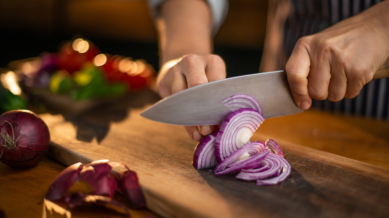 Speaking of sharp knives, there's no doubt that regardless of what you are chopping, a sharp knife is always easier and safer to use than a dull one (via Misen). This is doubly important with the onion, as the correlation between the release of those tear-inducing chemicals is proportional to the amount of damage inflicted upon the onion. The quicker and more efficiently you can cut an onion, the less likely it is to put up a fight, so to speak.