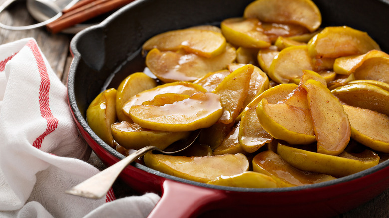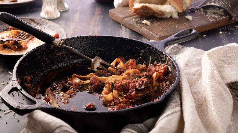 Again, while sticky foods can cause problems for your cast iron if you don't handle them the correct way, with the right precautions and steps, you can cook your favorite sticky items with ease. Lodge Cast Iron cautions that you shouldn't cook sticky foods in your cast iron if your piece is new and it hasn't built up those protective layers of seasoning that come over time. Otherwise, though, you should be fine when cooking sticky foods if you cook with the correct amount of fat and keep your cast iron seasoned throughout its lifetime. If you've already incorrectly cooked something particularly sticky on your cast iron, though, and are dealing with a real mess, the site recommends going at it with a pan scraper.