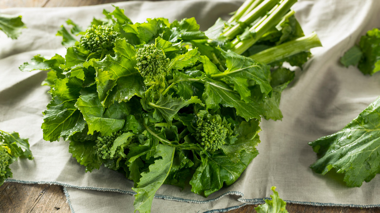 Another member of the cruciferous vegetable family, broccoli rabe is a leafy green that is not actually part of the broccoli family (via WebMD). Sometimes referred to as rapini, raab, spring raab, brocoletti, or Ruvo raab, its flavor is quite close to broccoli. However, it shares the nutritional benefits of broccoli and other members of the cruciferous family of veggies. This includes high amounts of vitamins C, E, K, and folate. Broccoli raab is a particularly rich source of vitamin K, with one serving providing 181 percent of the daily value (via MyFoodData). Vitamin K is important for keeping your bones healthy and for helping blood clot normally (via Harvard University).