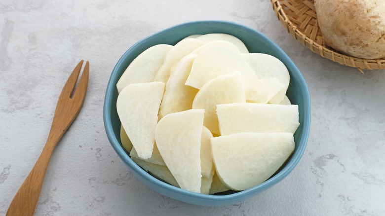 Delightfully crunchy and juicy, jicama is a staple in authentic Mexican cuisine. A cross between an apple and a potato, jicama plays well in both sweet and savory dishes. It's also nutritious and low in calories. One cup of raw, sliced jicama has 46 calories and 27 percent of the DV for vitamin C (via MyFoodData). If weight loss is your goal, jicama is a great snacking food due to its high composition of fiber and water. One cup of slices provides 21 percent of the DV for fiber, and 90 percent of its weight is comprised of water. Foods that are high in fiber and water provide volume but not a lot of calories (via Mayo Clinic). This helps you lower your total calorie intake while still filling full after eating.