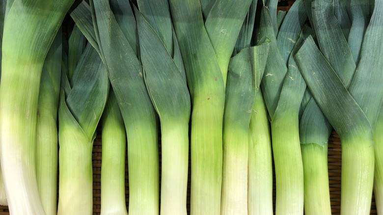If you love onions and garlic, you need to give leeks a try. Belonging to the same family as those two flavorful favorites, leeks look like giant green onions with their long stalks of tightly packed green leaves (via Science Direct). With a mild, sweet, oniony flavor they can be a stand-in — or addition — to regular onions in any of your favorite recipes. You'll often find leeks sliced and sauteed or fried. But you can make them the star of your dish, too. Warm and creamy leek and potato soup is a classic that's easy to make and infinitely comforting. You can also roast and braise whole leek stalks with butter and chicken broth.