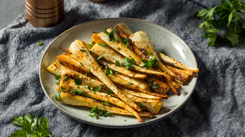 A root vegetable with a mild, earthy flavor, parsnips are a member of the carrot family and are rich in fiber (via Miedema Produce). Research shows that simply eating more fiber can help you achieve and maintain a healthy weight. That's because fiber doesn't provide any calories but it helps fill up your stomach so you can eat less but still feel satiated after your meal. Eating foods high in fiber can also help stabilize blood sugar, which can help reduce your risk of type 2 diabetes (via Mayo Clinic).