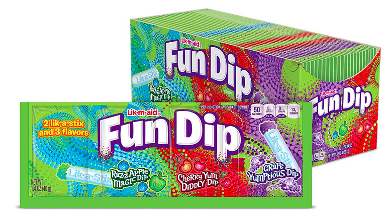 Fun Dip was the ultimate candy sensation — sugar and playtime all in one. In reality, Fun Dip was nothing but sugar and unnatural ingredients. Basically a level-up on the classic Pixy Stix candy, Fun Dip is a colorful powdered sugar candy that you eat by licking then dipping a candy stick inside the package. One package of Fun Dip, with the Fun Dip white candy stick and tangy powder is equivalent to about three packets of sugar (via Food Network).