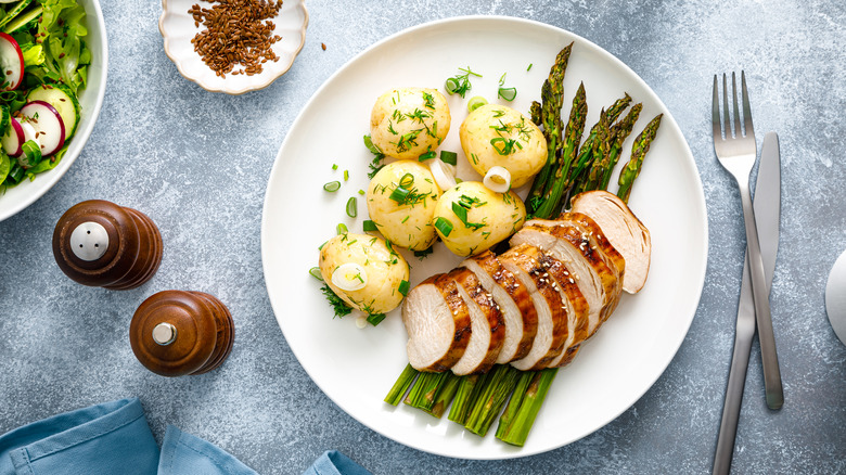If you like a little crunch, the skins of new potatoes roast very nicely. Depending on their size, which should be around 1.5 to 2.5 inches according to Agrow Fresh, they can be roasted whole (no knives required), or you can squish them after poaching for crispy smashed potatoes. Toss them in a little bit of high-quality olive oil and add salt and pepper and some potato-friendly herbs and spices and roast them in a hot oven for an easy, elegant side dish. If you want to get the skins extra crispy, you could also try using Chef Dan Kluger's method of tossing them in whipped egg whites before seasoning them and putting them in the oven.