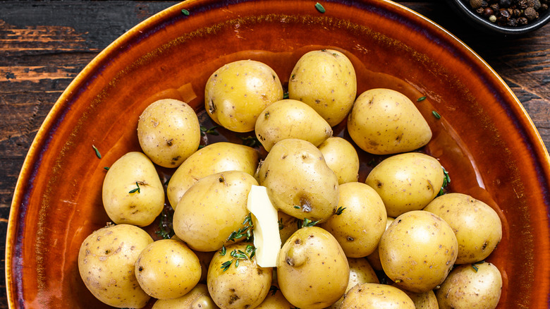 In the United States and other countries in the northern hemisphere, shop for new potatoes in farmer's markets and specialty grocery stores between April and July (per BBC GoodFood), and look for tubers that are dry and firm. It's ok if they still have dirt on them; because they are immature, baby potatoes need to be treated with a little extra TLC. While regular potatoes can endure some wear and tear thanks to their tough exteriors (perfect for potato skins), the skin on new potatoes is very thin and fragile and can even be scratched away if you scrub them too hard when you clean off any lingering dirt. When you get the potatoes home, gently wipe away the extra dirt and then give them a rinse. They're much more perishable than full-grown potatoes, so if you pick up a bag or two at the market, be prepared either to use them right away or to store them in a well-ventilated place for a day or two, such as loosely stowed in a paper bag.