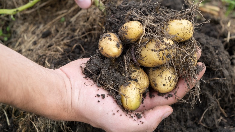 New potatoes are often confused with other kinds of small spuds, like fingerlings. However, new potatoes can actually be any variety of potato, they're just harvested early — usually within 60 to 90 days of planting (per The Press-Enterprise) or within a few days or weeks of the time that the plant starts to flower. Farmers dig up these early tubers to thin out the crop and make space for the remaining potatoes to grow into full size.