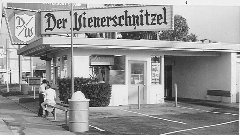 Today, Wienerschnitzel is the world's largest hot dog chain, reportedly serving more than 120 million frankfurters annually, but this big brand had humble beginnings. According to Thrillist, Wienerschnitzel was originally known as Der Wienerschnitzel, and when it opened in 1961, you could buy a hot dog for just 15 cents. Its founder, John Galardi, was a transplant from Kansas City whose first job in California was working for a restaurant called Taco Tia, the predecessor of Taco Bell. He decided to turn his new business into a drive-thru in order to keep people from loitering in the parking lot. This made Wienerschnitzel even more appealing to motor traffic, which worked out great since the original location was located in the LA neighborhood of Wilmington, right along the Pacific Coast Highway.