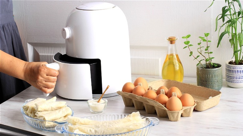 For those of you who enjoy a more savory breakfast, chef Meredith Laurence told Insider "there's no tidier way to cook bacon than in an air fryer." Air fryers not only contain the splatter of hot grease, but you can either cook your bacon strips on a designated tray or wire rack for extra crunch. The Rachael Ray Show also features air fryer frittata cups: an easy-to-assemble breakfast that can be made with a variety of mix-ins and also made in advance. You can even make all the necessary components of Food Network's air fryer breakfast tacos with a few silicone ice cube molds. When it comes down to upgrading your favorite breakfast dishes, never underestimate the many ways your air-fryer can transform or conveniently master your favorite breakfast foods.