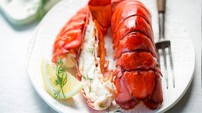 Lobsters are strange-looking creatures from the sea. They're trapped using pots and nets, they are noted for having beady eyes, and they don antennae, large claws, and an armor-like body. They're brown with hints of green when harvested and turn bright red when dropped in boiling water (per Maine.gov). Some people are intimidated by lobster and by eating lobster, according to Maine-based retailer Lobster Anywhere. That's one of the reasons lobster tails are popular — that and because the tails tend to be extra meaty. Fun fact: Lobsters work their tails as they scoot around in the water. As a result, the tail meat tends to be more fibrous than the tender meat of the claws.