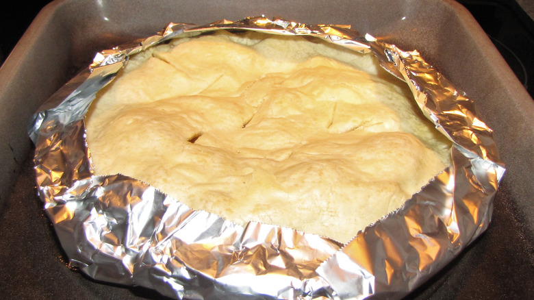 It can sometimes be tricky to bake pies because certain fillings require a bake time that's much longer than what the crust needs. Luckily for you, we have an aluminum foil hack to save the edges of your pie crust, so you no longer need to deal with burnt borders. Some pies, like custard pies, turn out better when you par-bake the dough because it keeps the crust from turning mushy. Yet, that also means that the dough is in the oven longer than the rest of the pie. If you have a baked crust, it isn't beneficial to keep it exposed to the heat; cover it so that it doesn't darken any further.