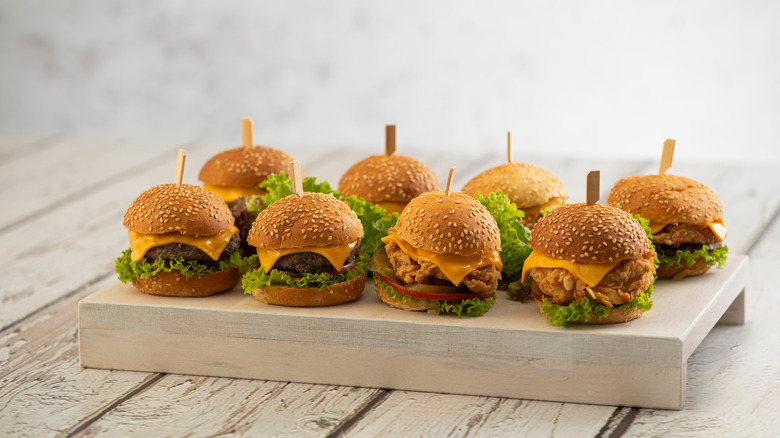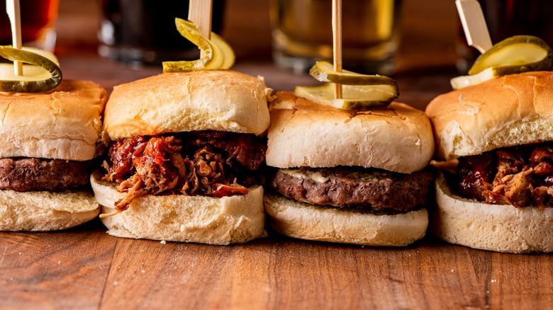 However, chefs have different perspectives on how to define a slider, or whether they should even use the name. Some restaurants suggest that specifically, a slider "is not just a small burger — a slider is a small burger where the patty is cooked with onions and pickles," (per American Social Bar & Kitchen). Other restaurant owners elect not to use the term sliders, possibly because of its link to fast casual spots.
