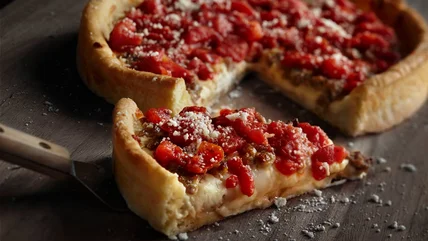 The creation of Uno Pizzeria and its 'za dates back to the mid-20th century. Back in those days, per the BBC, Italian immigrants had already filled Chicago with Americanized versions of Neapolitan pizza. Then, in 1943, Ike Sewell and Ric Riccardo opened up a Windy City restaurant with its own spin on 'za. Uno Pizzeria's hour-baked, buttery, crunchy crust rose so high that its pizza pie was more like a fruit pie in stature, allowing for extra ingredients to be mixed in and inverted (sauce on top).