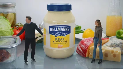 Hellmann's posted its Super Bowl 2023 ad to its YouTube channel. The offbeat commercial features actors Jon Hamm and Brie Larson inside a refrigerator. The actors talk and conclude that they are in there among other foods due to a play on their names — Hamm and Brie — which sounds like the lunch meat and cheese, respectively.