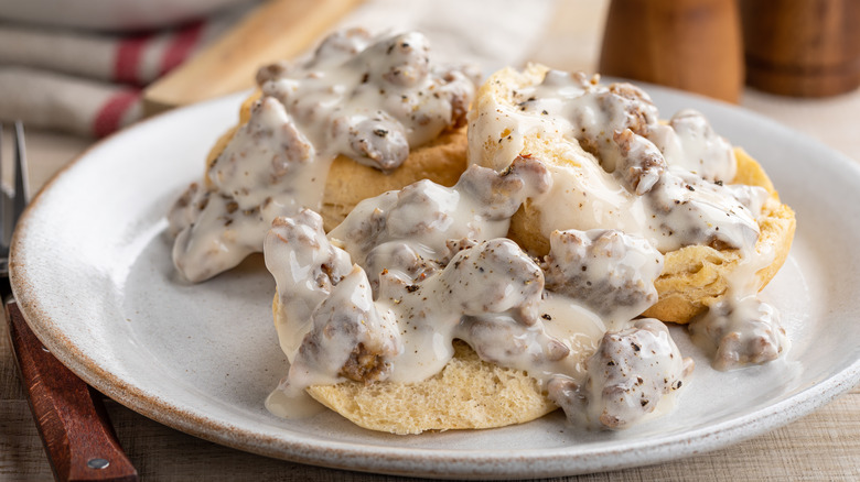 Sausage gravy, the classic companion to biscuits, is an American breakfast staple. It originated as a working class recipe created from low cost, available ingredients like pork and flour and fed lumber workers and other laborers across Appalachia and the South, according to The Washington Post. Today, sausage gravy is served everywhere from greasy spoon diners to posh brunch spots, and is enjoyed by folks from all walks of life, ladled over everything from biscuits to hash browns to fried chicken.