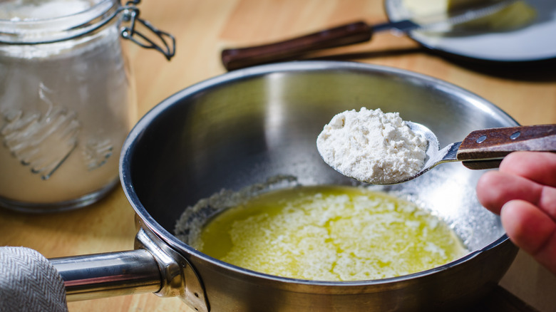 Now that you have your flavorful fat and your kitchen is no doubt filled with delectable aromas, it's time to make the roux. This is arguably the most important step in the gravy-making process. Make it incorrectly and your gravy can be lumpy, watery, or stodgy while perfecting your roux means you'll have a rich, silky gravy every time.