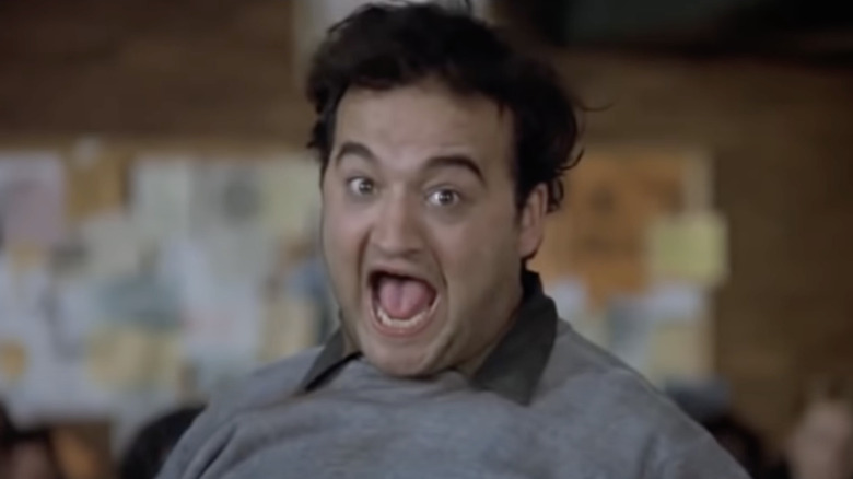 Bluto takes a large bite of mashed potatoes and punches his cheeks, spitting everything out at the squares. He's a zit! Bluto laughs and makes silly noises as the preppy frat boy chases him around. After he tricks all the uniformed dressed men into fleeing the cafeteria to run after him, Bluto returns, declaring "food fight!" The entire room follows suit, obviously, and the air is filled with food.