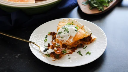 Then, top the beef with ⅓ of the cheese. Cover the first layer with another tortilla, and then add the rest of the meat and half of the remaining cheese. "If you don't have tortillas large enough to cover the surface of your dish, you can layer smaller tortillas to make a layer," Johnson notes.