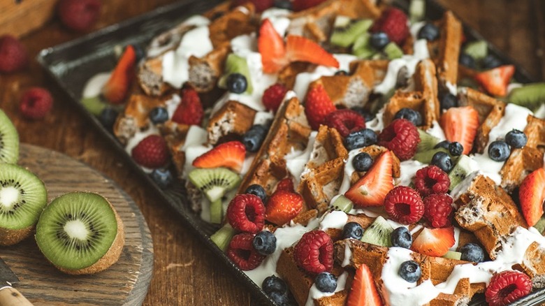 Use your creativity to make breakfast nachos with waffle pieces, like the frozen waffle brand Kodiak Cakes demonstrates on Facebook. To do so, grab the frozen waffles and toast them. Then, cut them into quarters and layer them across a large serving dish, so they're easier to pick up and eat once you garnish them. Drizzle or dollop vanilla or flavored yogurt, such as strawberry, peach, or blueberry, across the top. For the toppings, sprinkle chopped-up strawberries, bananas, and pineapple over the top, and maybe even a little bit of honey. You can add bite-sized berries, too, like blueberries and raspberries.