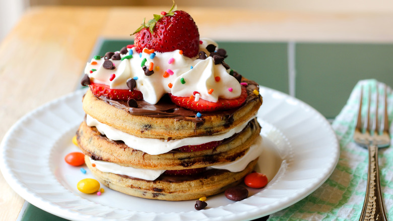 You could even make a black forest-themed waffle treat if you're a fan of cherries or raspberries. A brilliant Redditor suggested this in a forum, and it is the bee's knees. Grab a few waffles and layer them up with raspberry or cherry jam, chocolate shavings, whipped cream, and chocolate sauce. Once you finish, it looks like a mini layered cake, especially if you add ingredients on the top and sides of the waffles.
