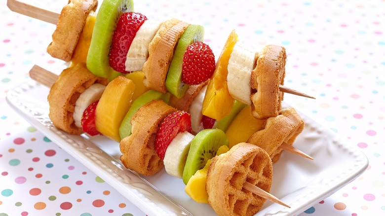 To build the kabobs, chop the fruit into bite-sized pieces before you slide them onto wooden skewers. In between the fruit pieces, pierce the waffle pieces onto the stick. Create a colorful pattern or add the components in a more sporadic order. For best results, build the kabobs immediately before you serve them. If not, the cooked waffles could end up soggy or stale, making the experience less enjoyable.