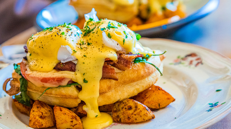 If your favorite time of day to enjoy waffles is breakfast, that's understandable. A classic buttery waffle is undoubtedly delicious, but sometimes you need something heartier to satisfy your hunger for longer. This is where egg Benedict waffles come into play. If you've never had classic eggs Benedict, the dish consists of an English muffin split in half and topped with Canadian bacon and poached eggs. The whole breakfast is then layered with rich hollandaise sauce.