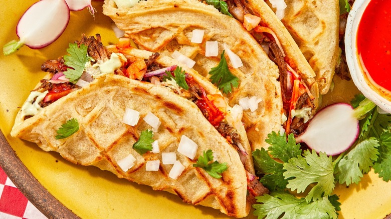 If you don't have tongs, form the waffles into the shape of a shell and use kitchen twine or toothpicks to hold their shape. Cook them in the conventional oven until they're lightly brown and firmer. Pro tip: they'll snap in half if you toast them without bending them first, so make sure you shape the tacos before cooking them up. Once your taco shells are ready, load them with chicken, pork, or beef. Add ingredients such as lettuce, diced tomato, onions, cheese, or guacamole to finish them off.