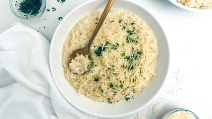 Apart from the use of the Instant Pot, however, this recipe is a really traditional one using nothing more than broth, a shallot, garlic powder, and Parmesan to flavor the rice and some half-and-half to give it a creamy consistency. It's important to use the proper rice, however. As Vergara explains, arborio is a high-starch rice, and when cooked, she says, "result[s] in a firmer, chewier, and creamier rice" than if you used any other type to make your risotto.