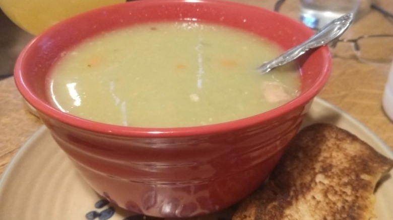 Split Pea with Ham and Bacon soup is a condensed soup that is nearly exactly what it sounds like: A blend of split peas, ham, and smoked bacon, with some carrots and celery added for some crunch. Split Pea soup in and of itself is a dish with a lot of history, even gaining its own week in November called National Split Pea Soup Week. It is a hearty soup with many variations and known additions, but the Campbell's version with ham and bacon is one of the most well-known versions.