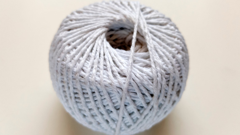 Aside from trussing birds, there are plenty of ways to utilize cotton twine in your kitchen. A tidily-tied roast holds on to its fillings and its moisture alike, and cured meats that are tied and hung up are easier to cut and have ample airflow for the aging process. Cotton twine is also great for keeping boxes closed and bundling ingredients together. The Los Angeles Times recommends soaking your twine prior to high-heat cooking so it won't burn, and reminds cooks to remove any string before serving a finished dish, because as useful as it is, twine's not good to eat.